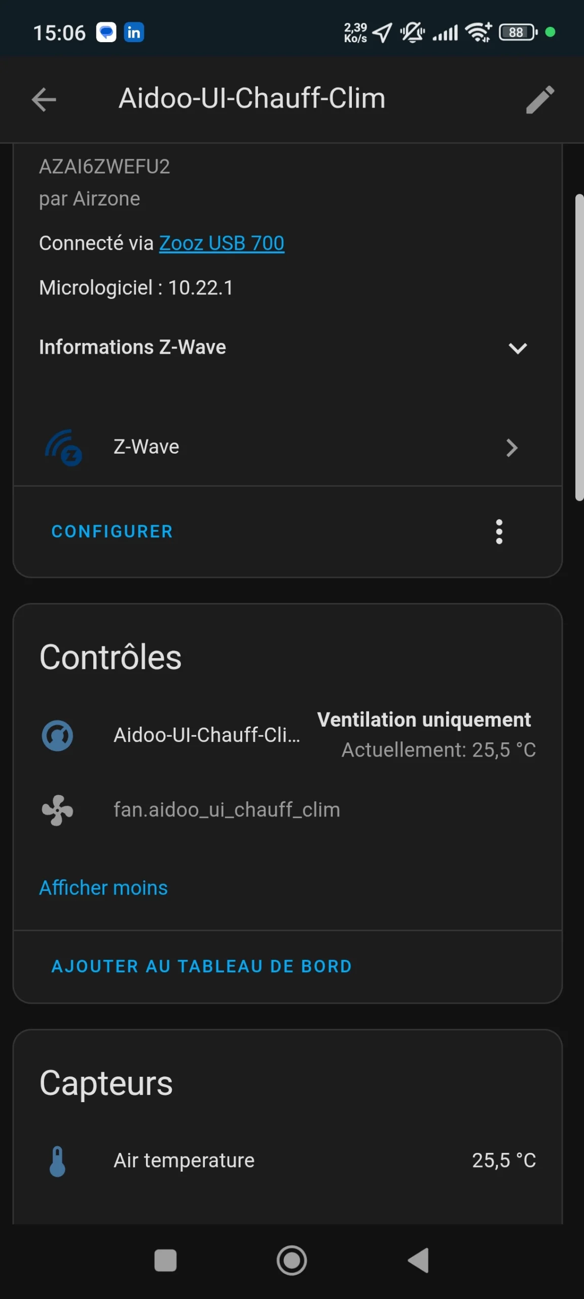 Nous pouvons voir la version du micrologiciel, les éléments de contrôle (mode, température, vitesse du ventilateur, etc…) ainsi que les éléments Zwave