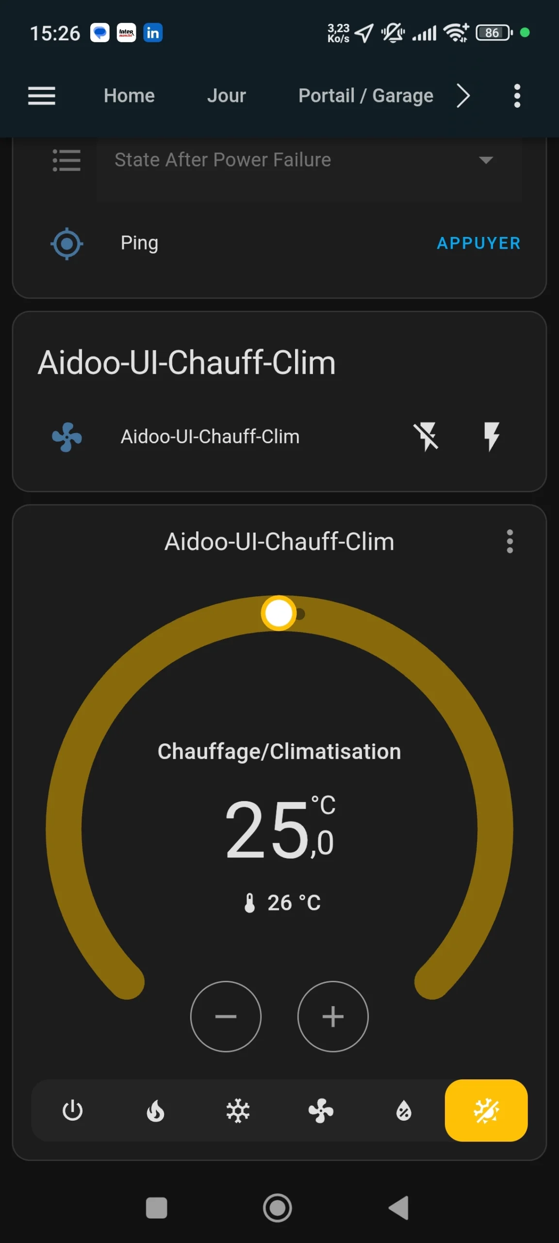 L’interface depuis Home Assistant est très simple et apparait comme un thermostat représentant le panneau de contrôle.