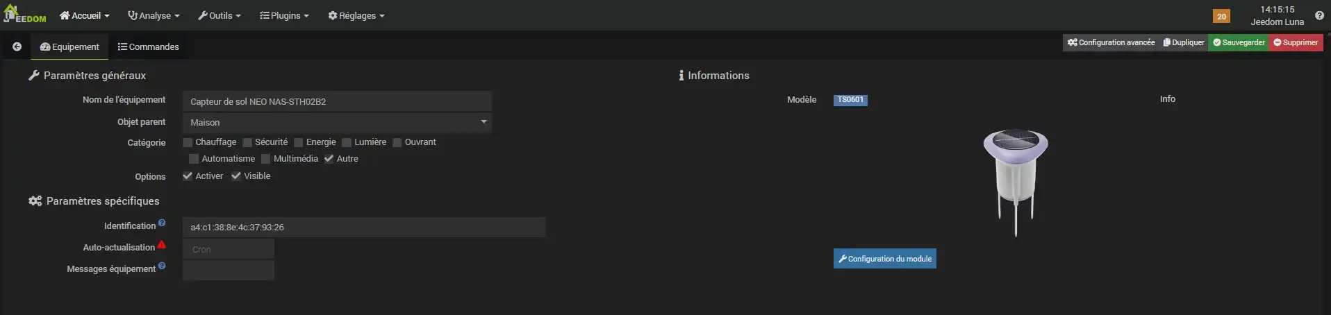 Une fois la procédure d’inclusion réalisée, Jeedom vous dirigera vers la page dédiée à la configuration de l’équipement.