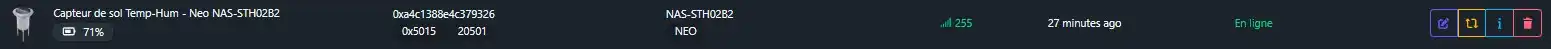 L’équipement est disponible dans la zone « Appareils », il est possible de renommer simplement en cliquant sur l’icône bleu, reconfigurer avec l’icône orange et le supprimer avec l’icône rouge.
