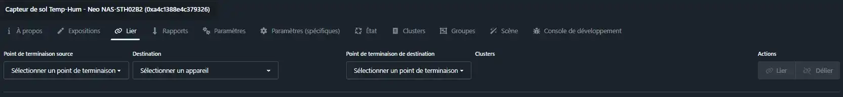 L’onglet « Lier » permettant de lier / délier l’équipement (binding).
