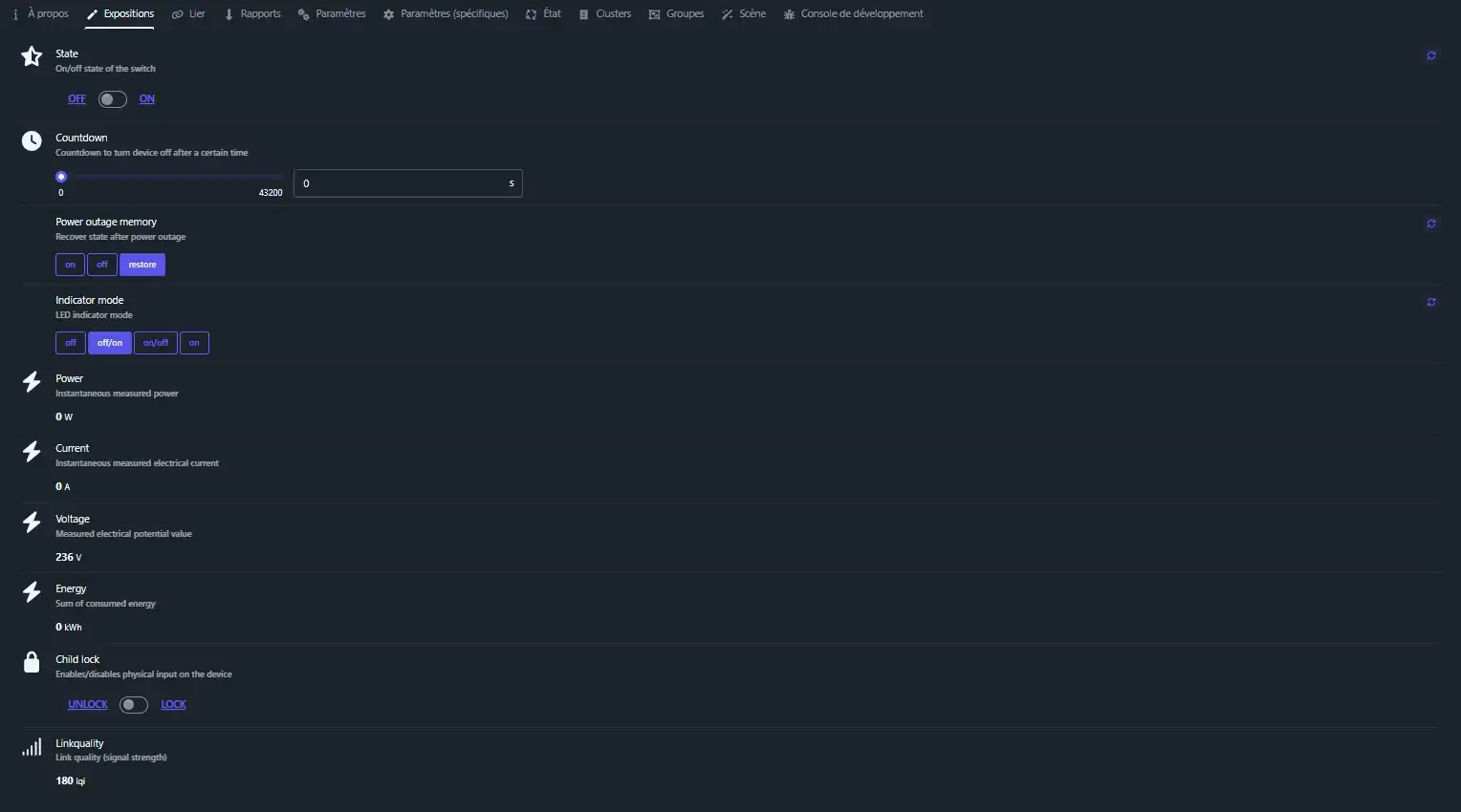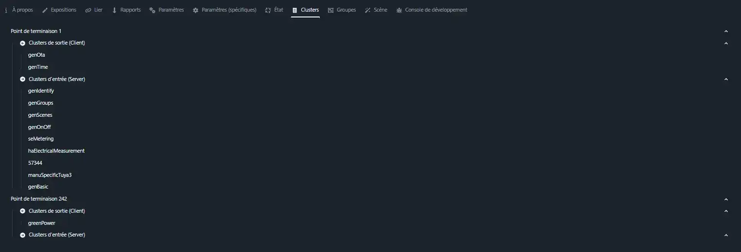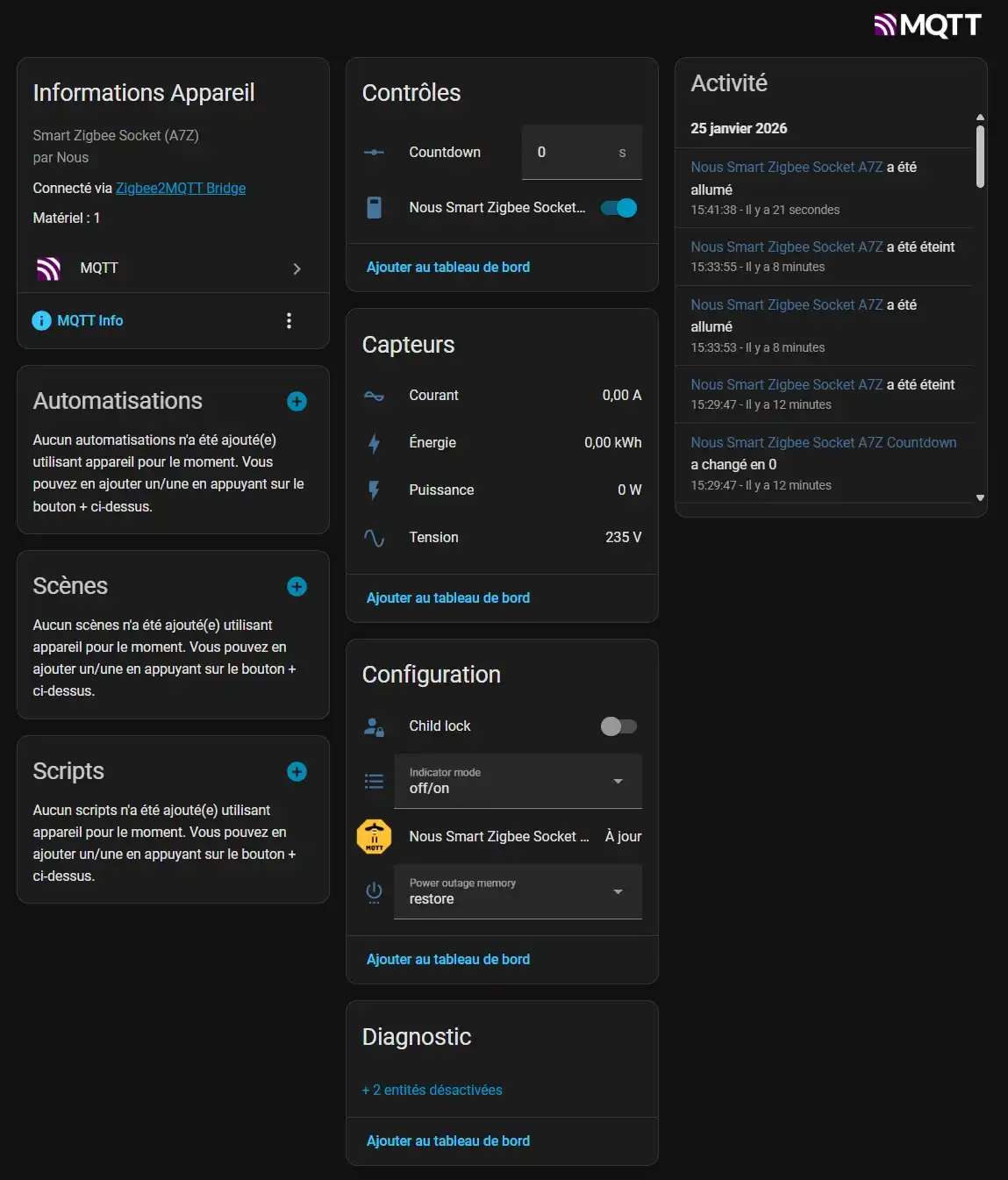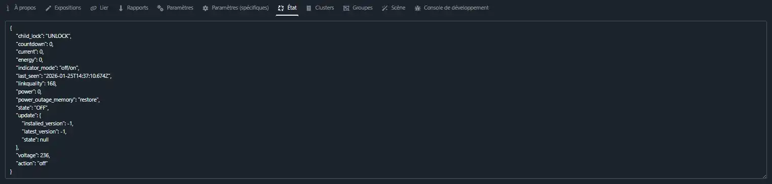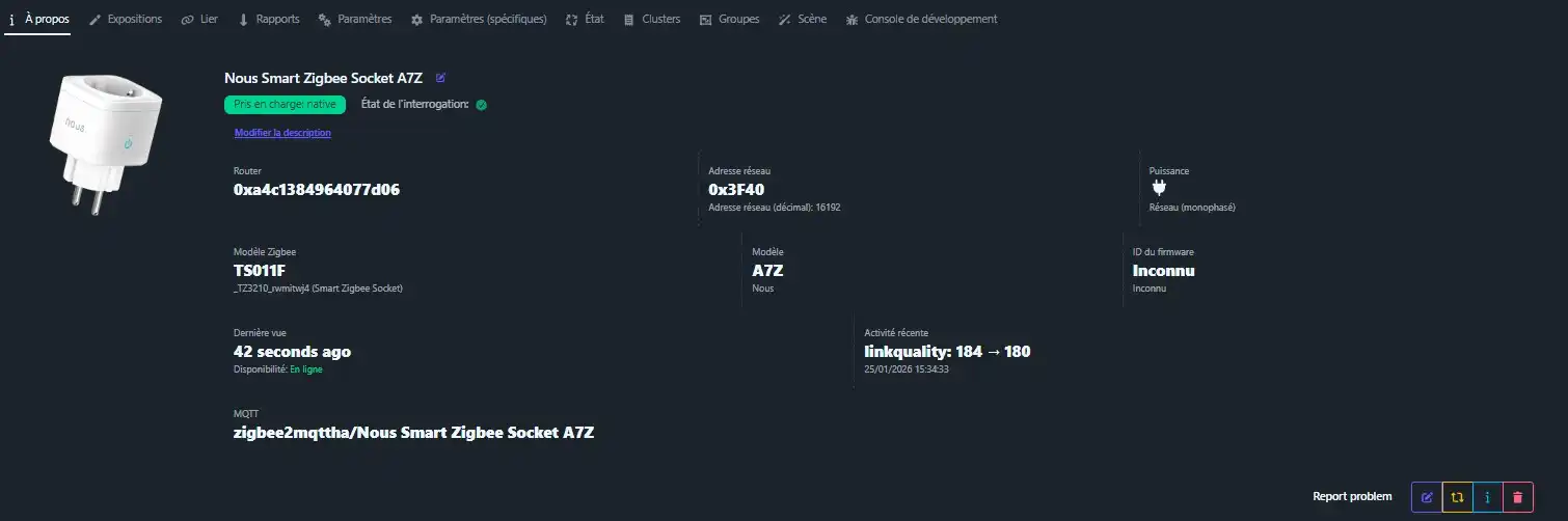 L’équipement apparait comme ci-dessous sur le tableau de bord Zigbee2MQTT.