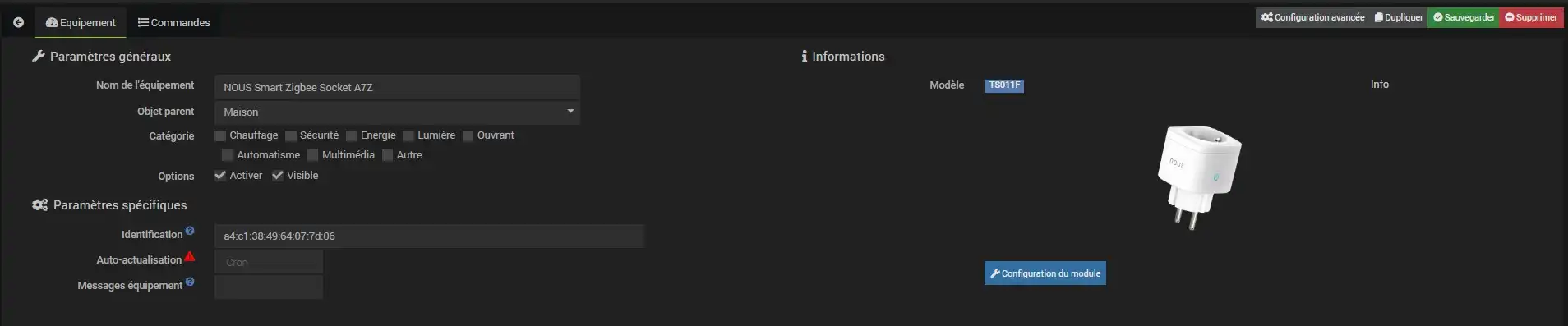 Une fois la procédure d’inclusion réalisée, Jeedom vous dirigera vers la page dédiée à la configuration de l’équipement.