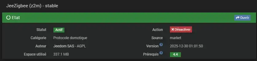 Dans cette présentation, nous avons utilisé une box Jeedom Luna 4G avec le plugin JeeZigbee officiel Jeedom utilisant Zigbee2MQTT. L’intégration fonctionne également avec la box Jeedom ATLAS un dongle Zigbee.