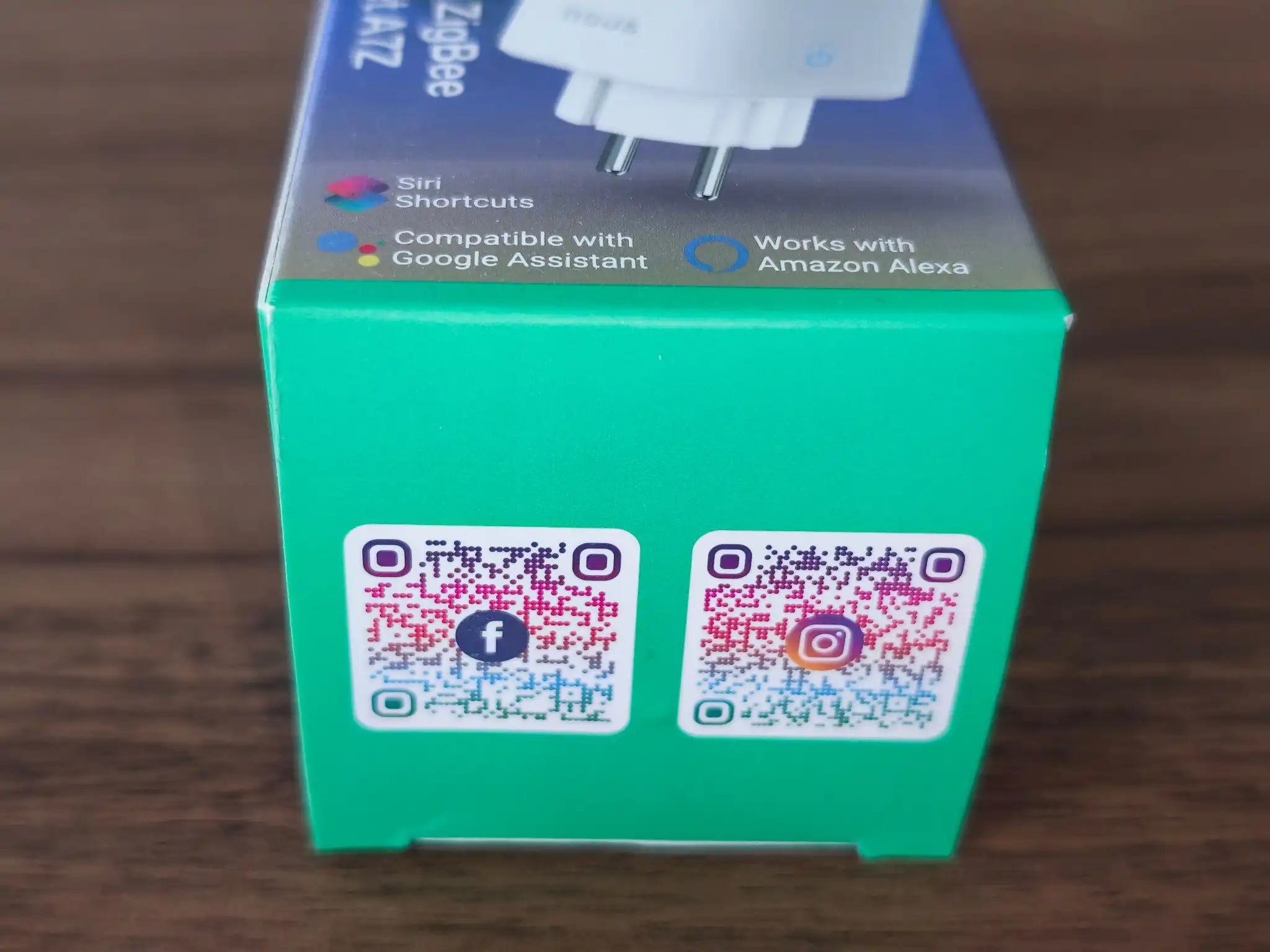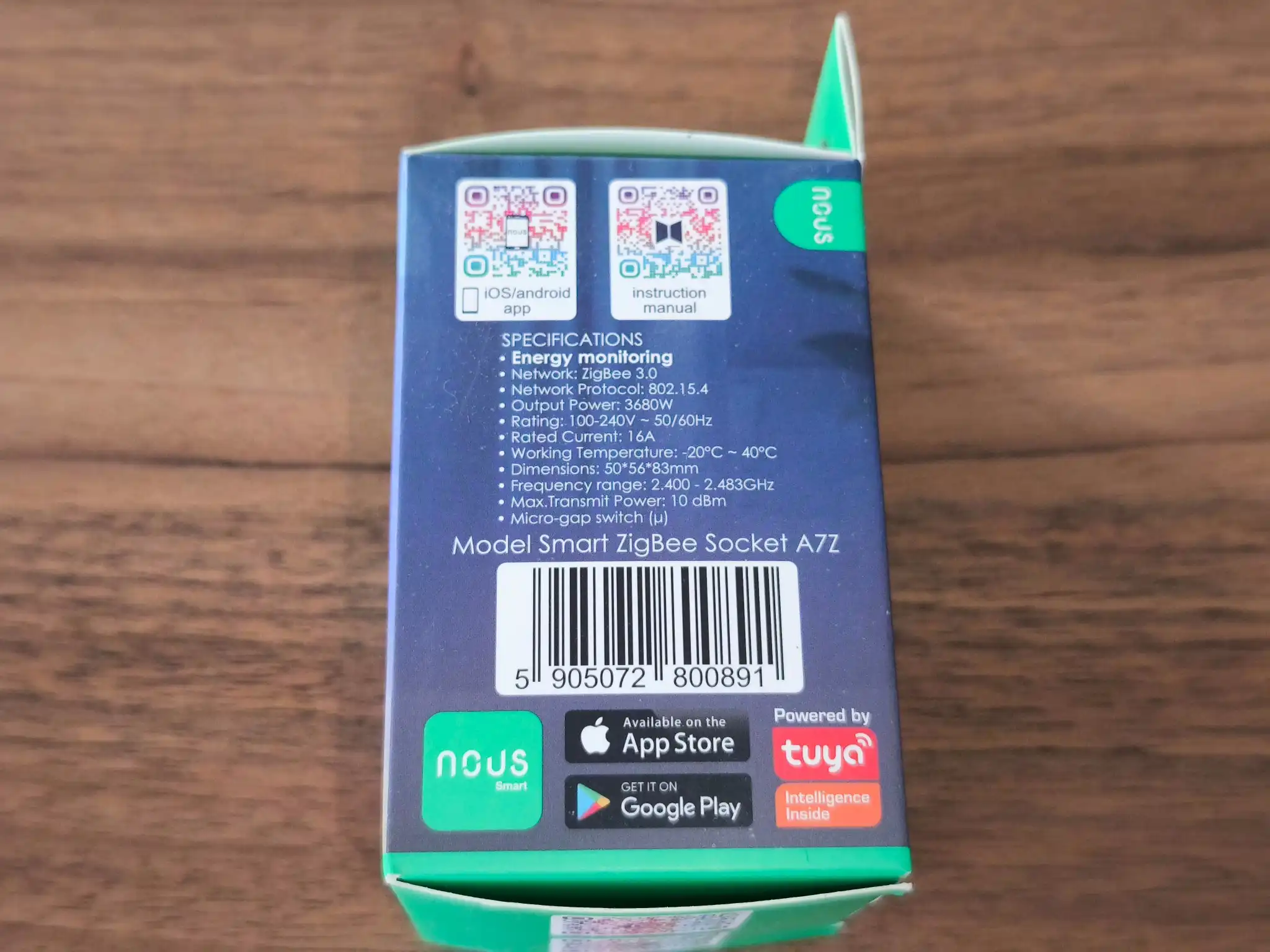 La prise est présentée dans un emballage bleu et vert, nous voyons la marque Nous, le nom du modèle, le protocole utilisé, une compatibilité avec Zigbee2MQTT et les assistants vocaux