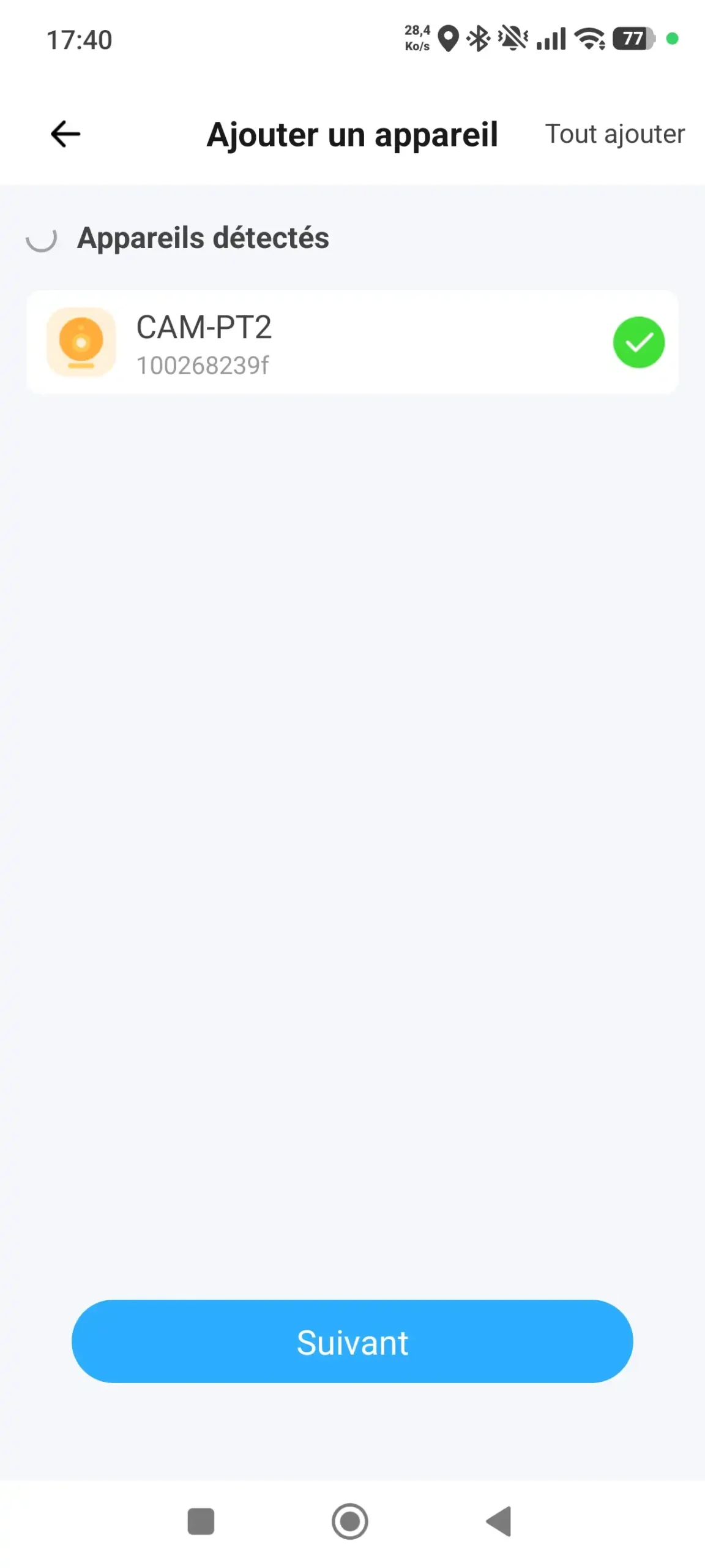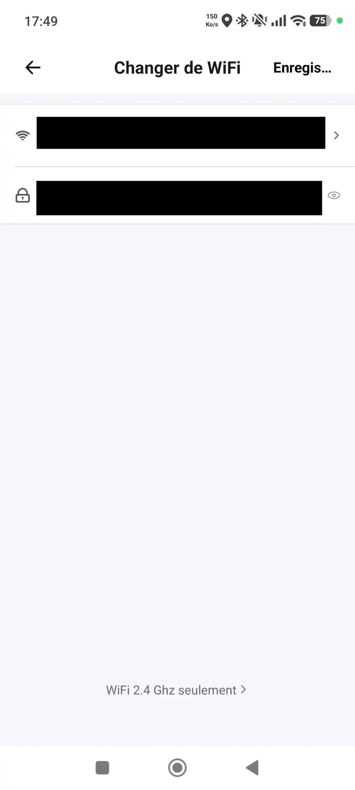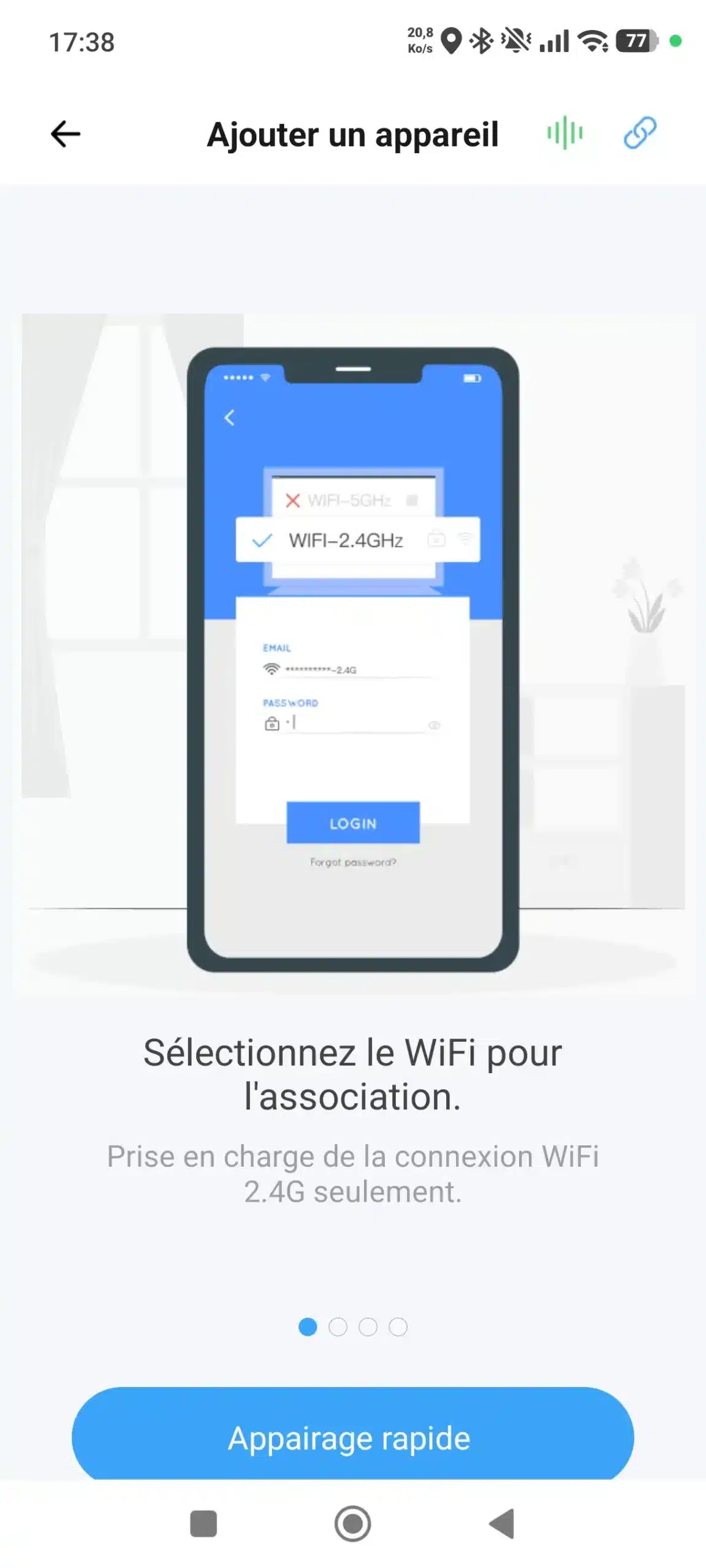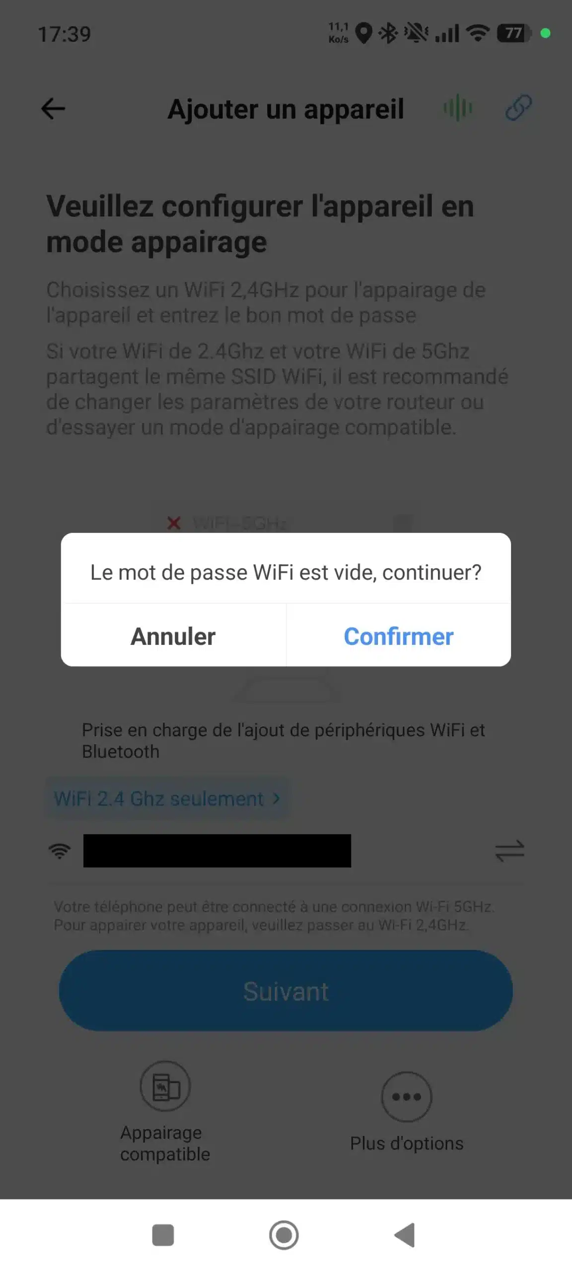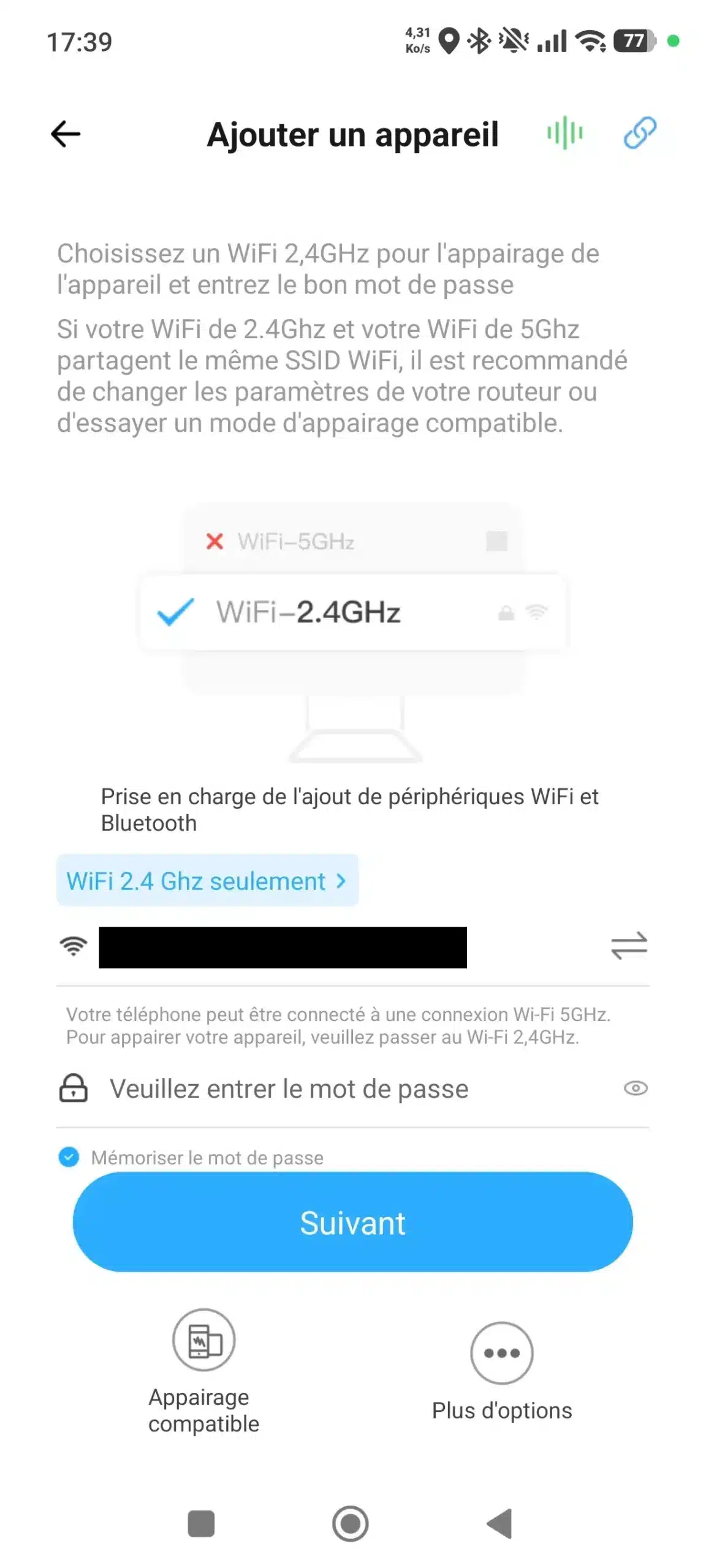 Le système vous demande ensuite de choisir un point WiFi 2,4GHz ayant le même SSID que votre smartphone (ou tablette), renseignez les informations de votre point WiFi