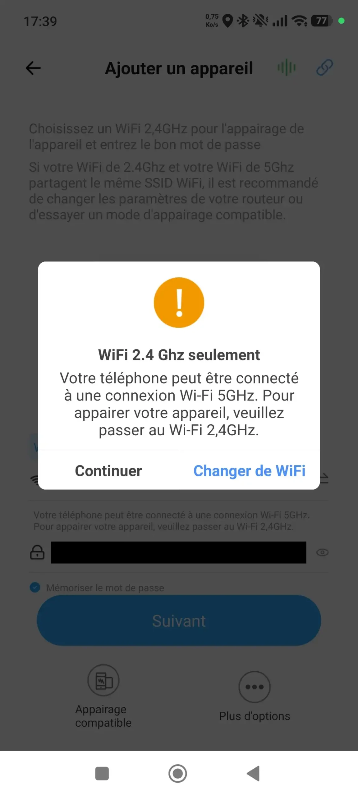 Si votre smartphone utilise un WiFi sur une fréquence de 5GHz vous aurez ce message qui s’affiche, vous pouvez valider ou changer. Ensuite la caméra se connectera a votre réseau WiFi