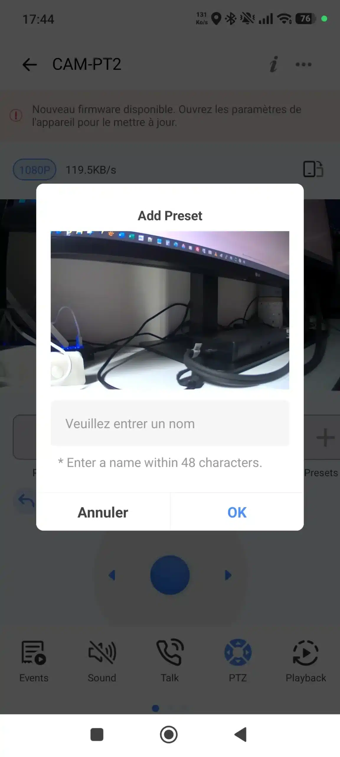 Il suffit de positionner la caméra, puis ajouter en cliquant sur un Preset disponible via le « + » et lui donner un nom. Sonoff a même pensé a donner accès au manuel de la caméra via l’application