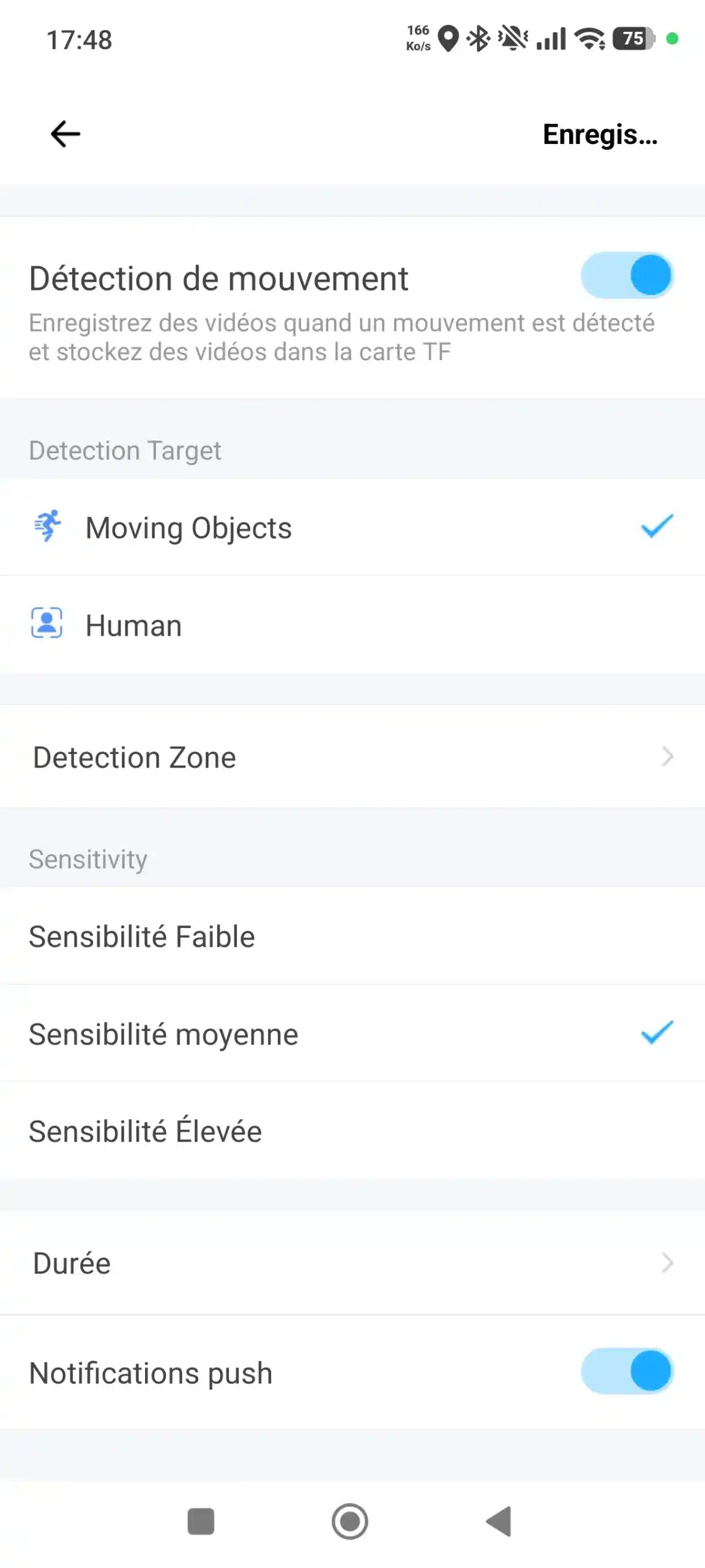 La détection de mouvement est très simple a utiliser avec la détection d’un humain ou le suivi de mouvements, la sélection d’une zone et trois niveaux de sensibilité avec un réglage de la durée de détection et des notifications Push sur l’application