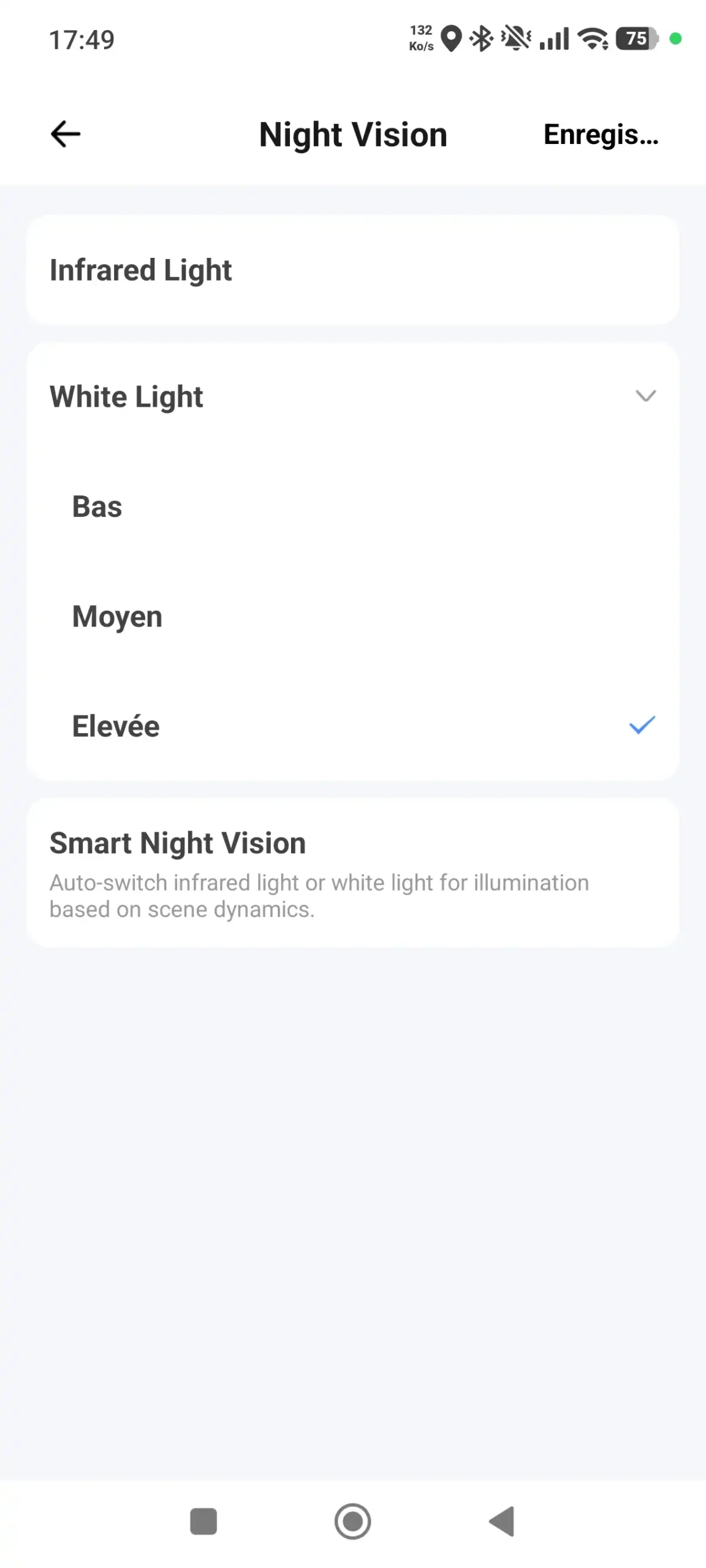 La vision nocturne peut être activée en utilisant les voyants infrarouges ou les voyants blancs. Ces voyants blancs possèdent trois niveaux de réglages. Le déclenchement de la vision nocturne est automatique.