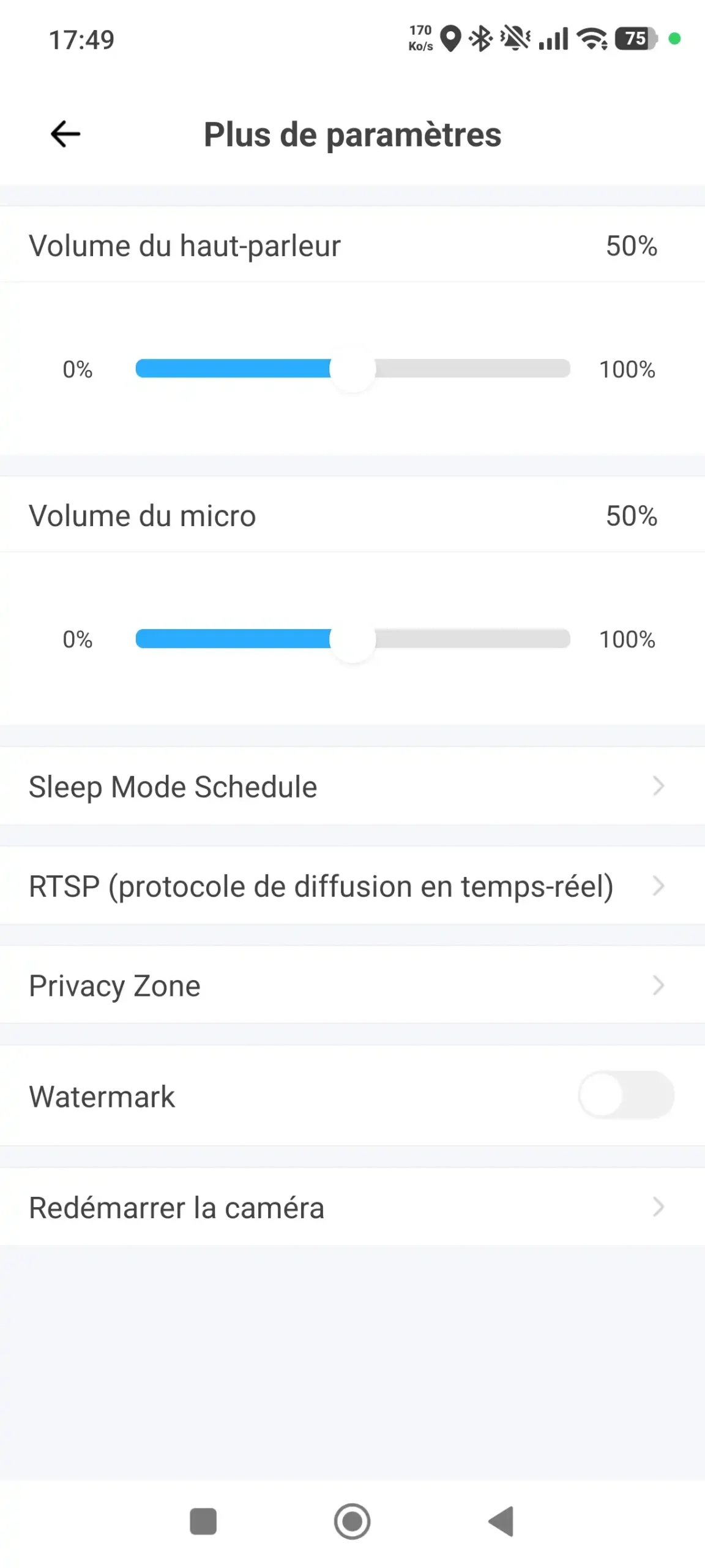 Dans la rubrique Plus de paramètres, vous pouvez régler le niveau du volume du haut-parleur et du microphone, d’autres réglages sont disponibles, en particulier le RTSP, le masquage de zone de confidentialité, le texte affiché sur le flux vidéo ou encore le redémarrage a distance de la caméra 360°