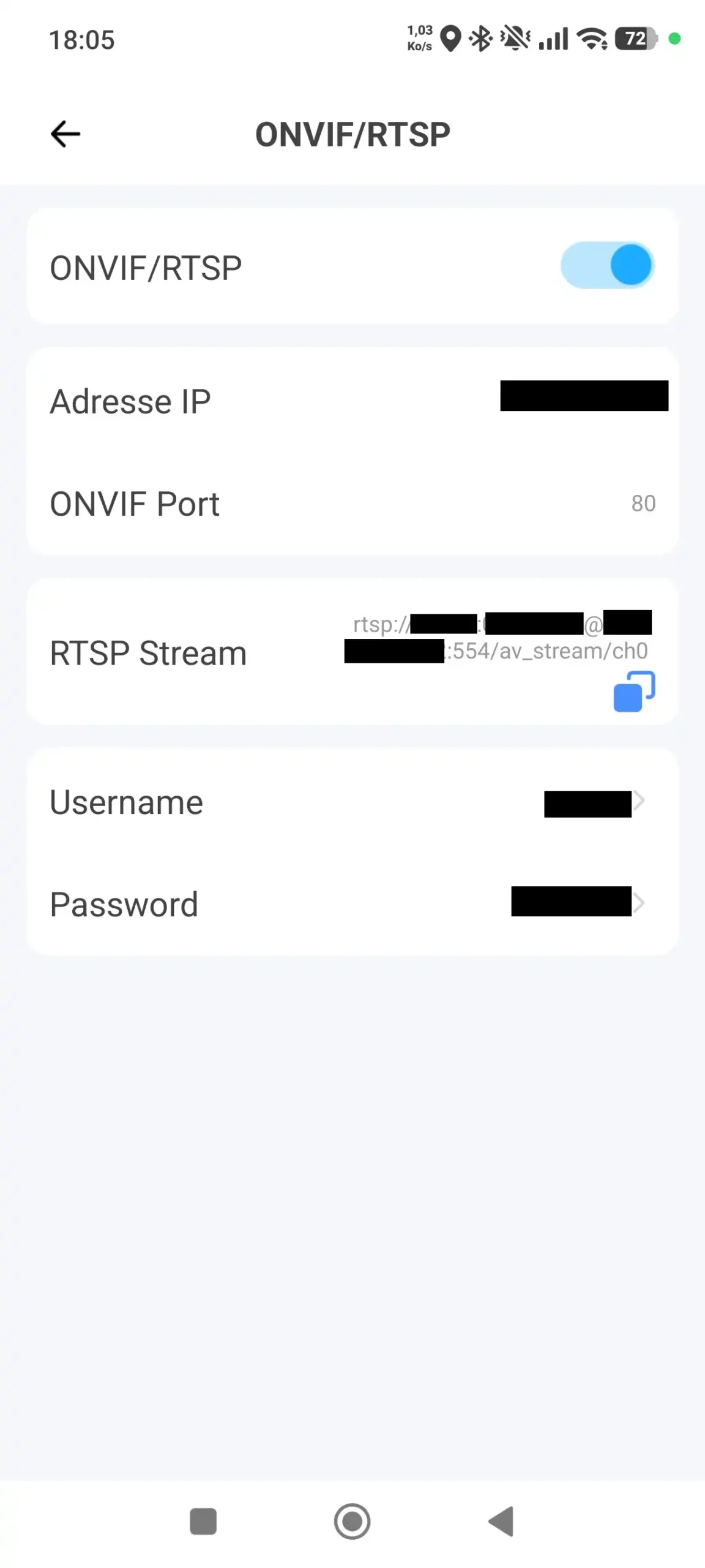 Vous voyez maintenant apparaître la partie ONVIF avec le RTSP, le ONVIF utilise les mêmes identifiant et mot de passe