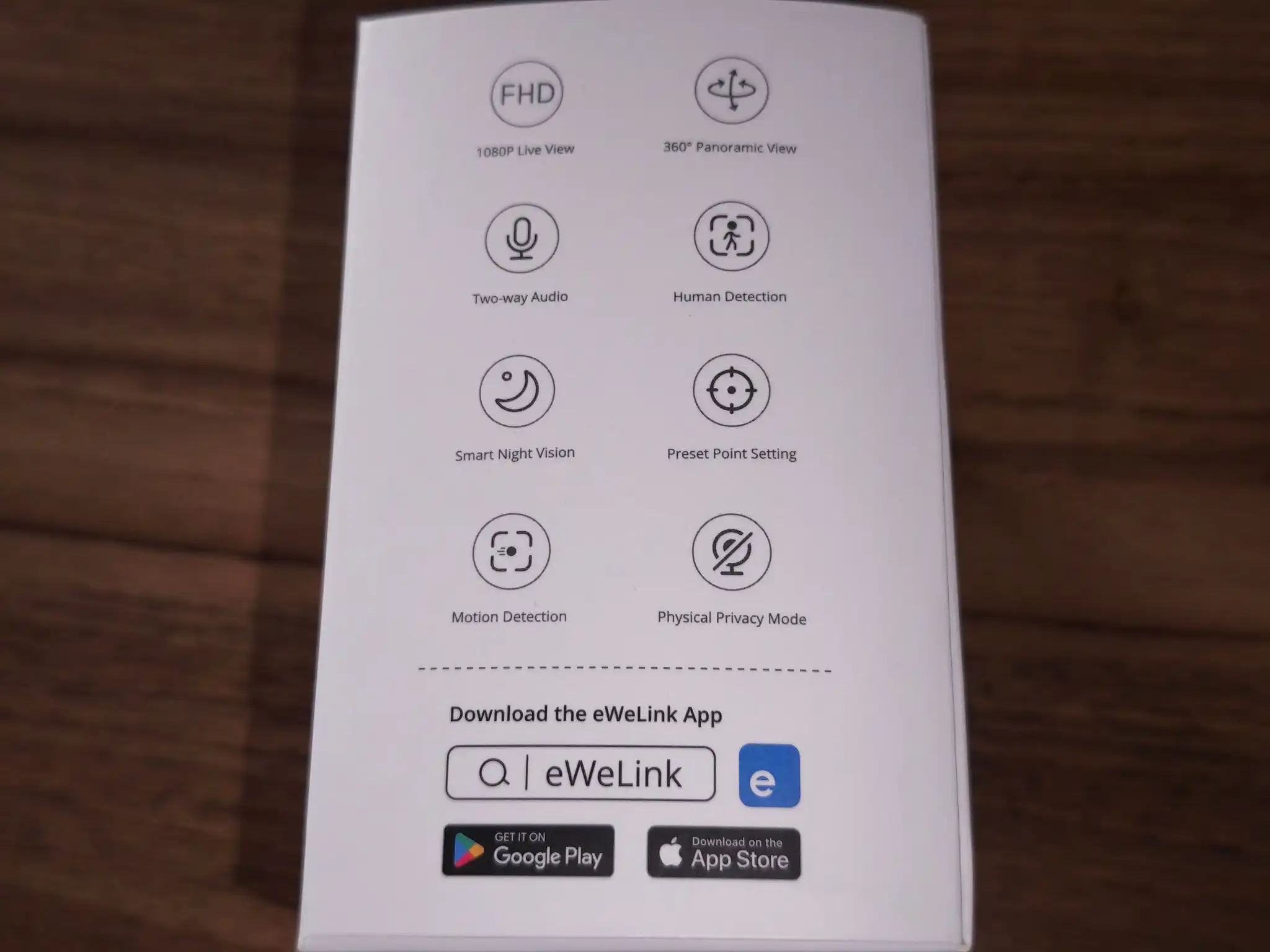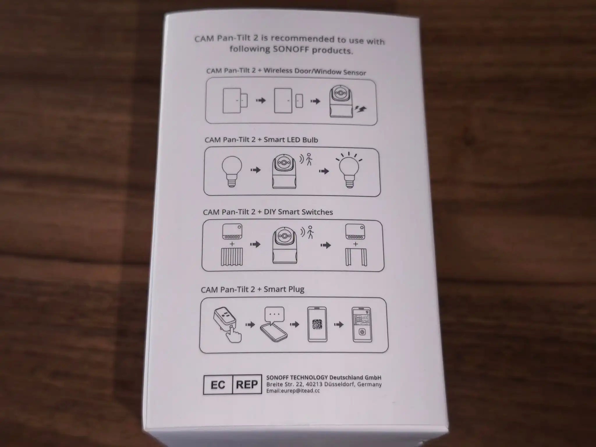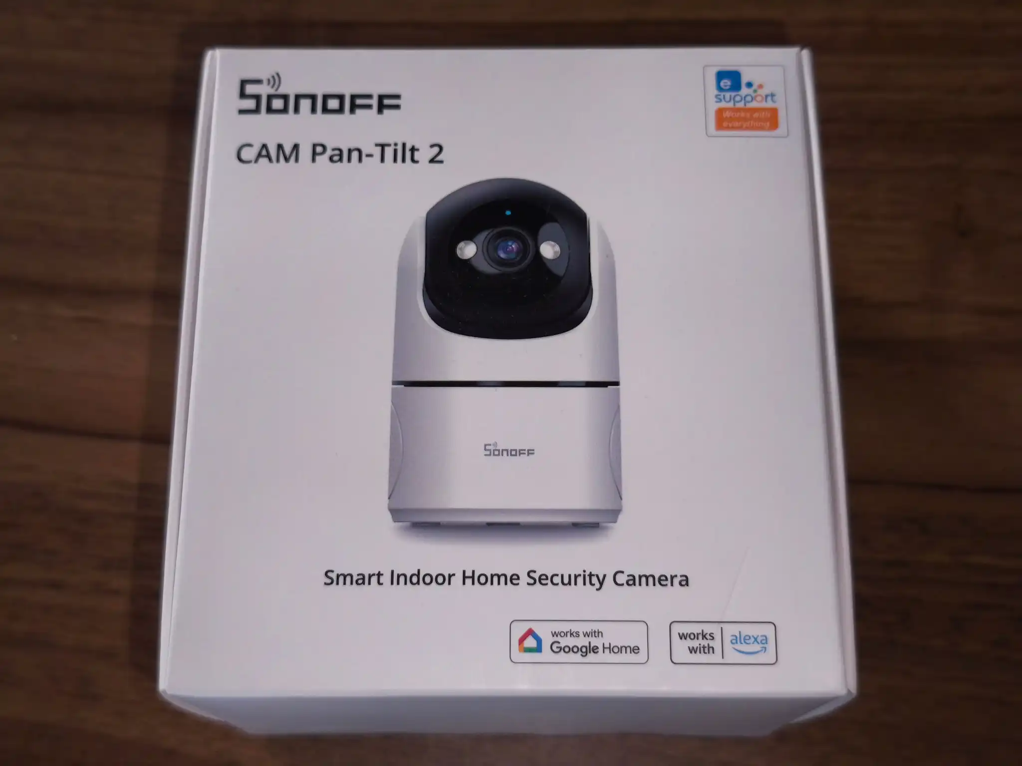 La caméra 360° Sonoff Pan Tilt 2 est présentée dans un étui blanc, nous voyons l’image de la caméra, la marque Sonoff, le nom du modèle, la fonction de celui-ci et les assistants vocaux compatibles