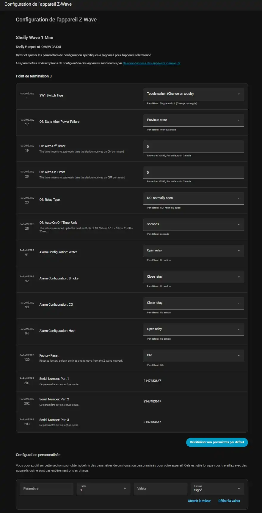 La roue crantée vous permettra de visualiser l’ensemble des paramètres Z-wave du module