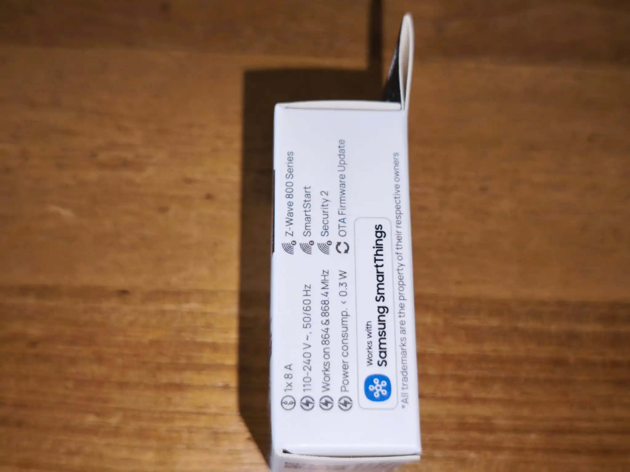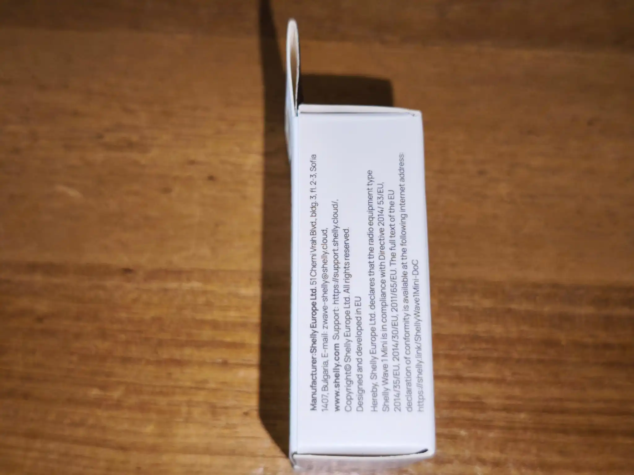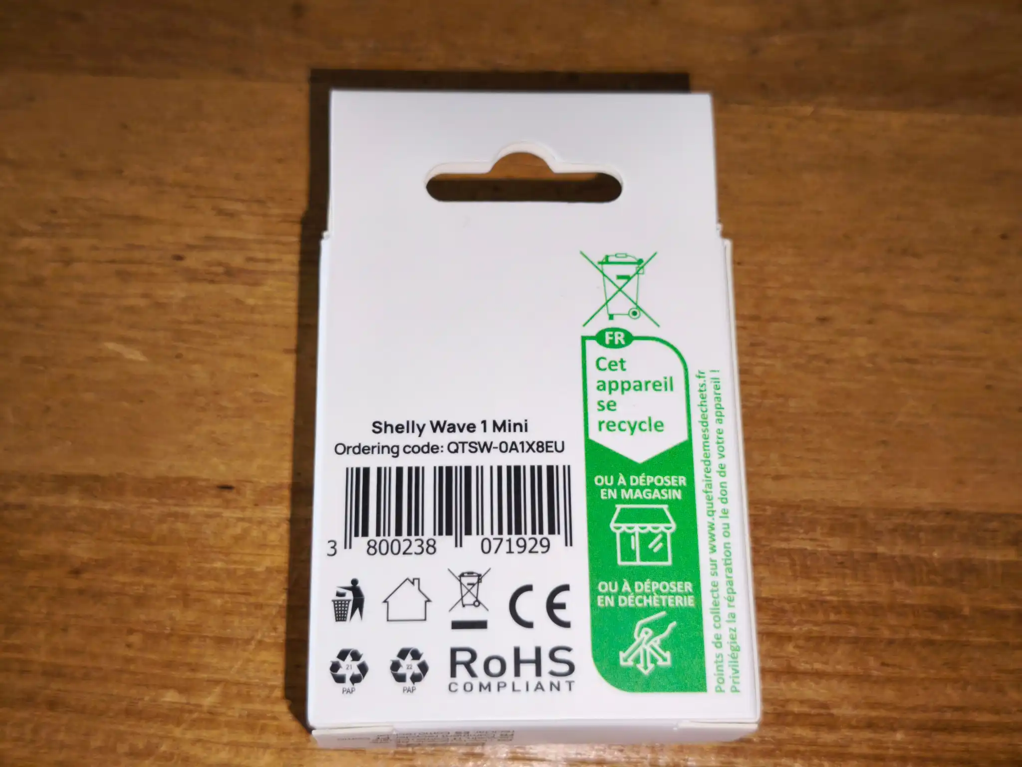Le module Shelly Wave 1 Mini Long Range est présenté dans un etuit blanc, nous pouvons voir la marque, le nom du module, la photo, la fonction, la fréquence et le protocole utilisé