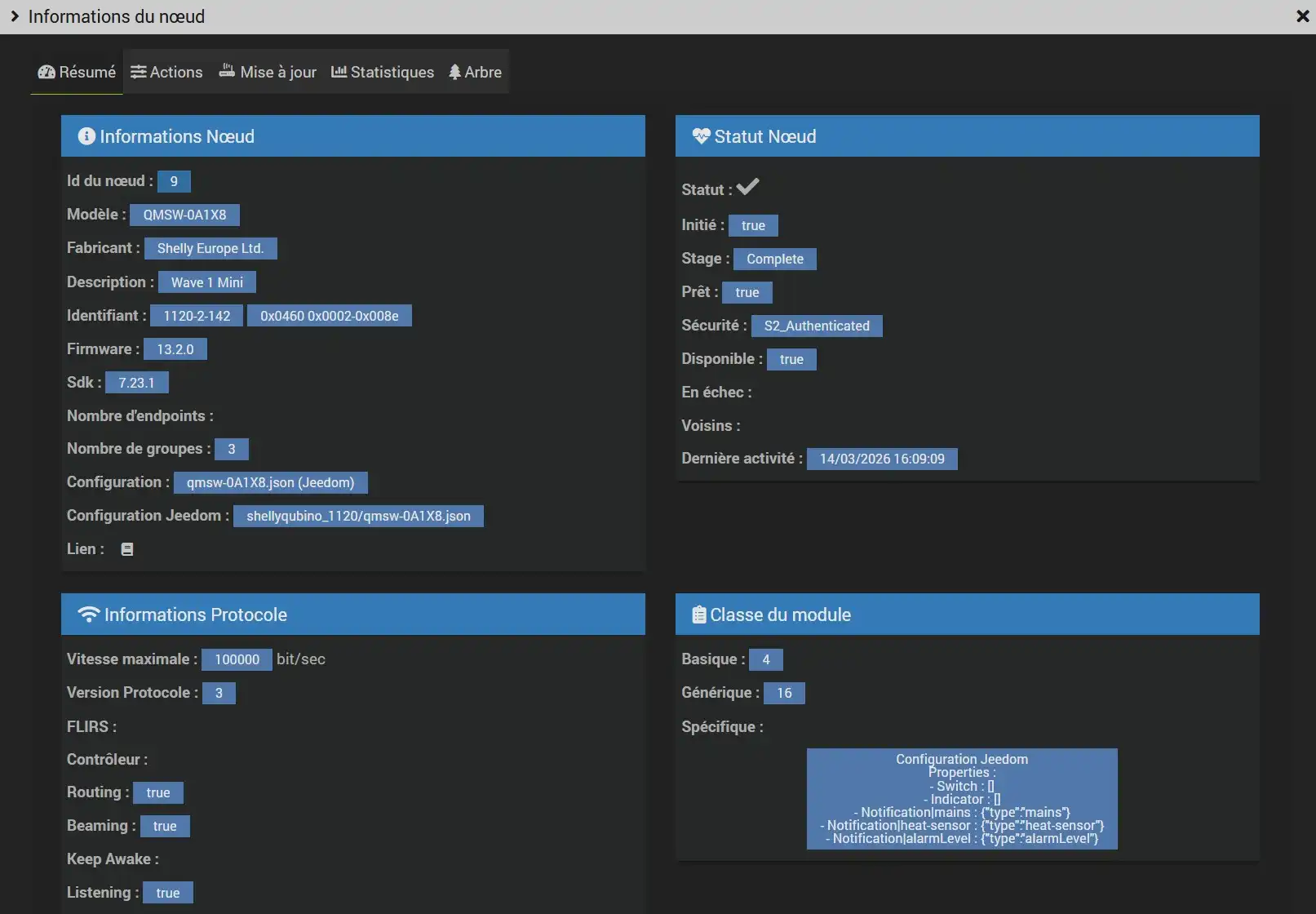 Le bouton Nœud permet de voir l’ensemble des informations du module On-Off Zooz XS Relay Zen57
