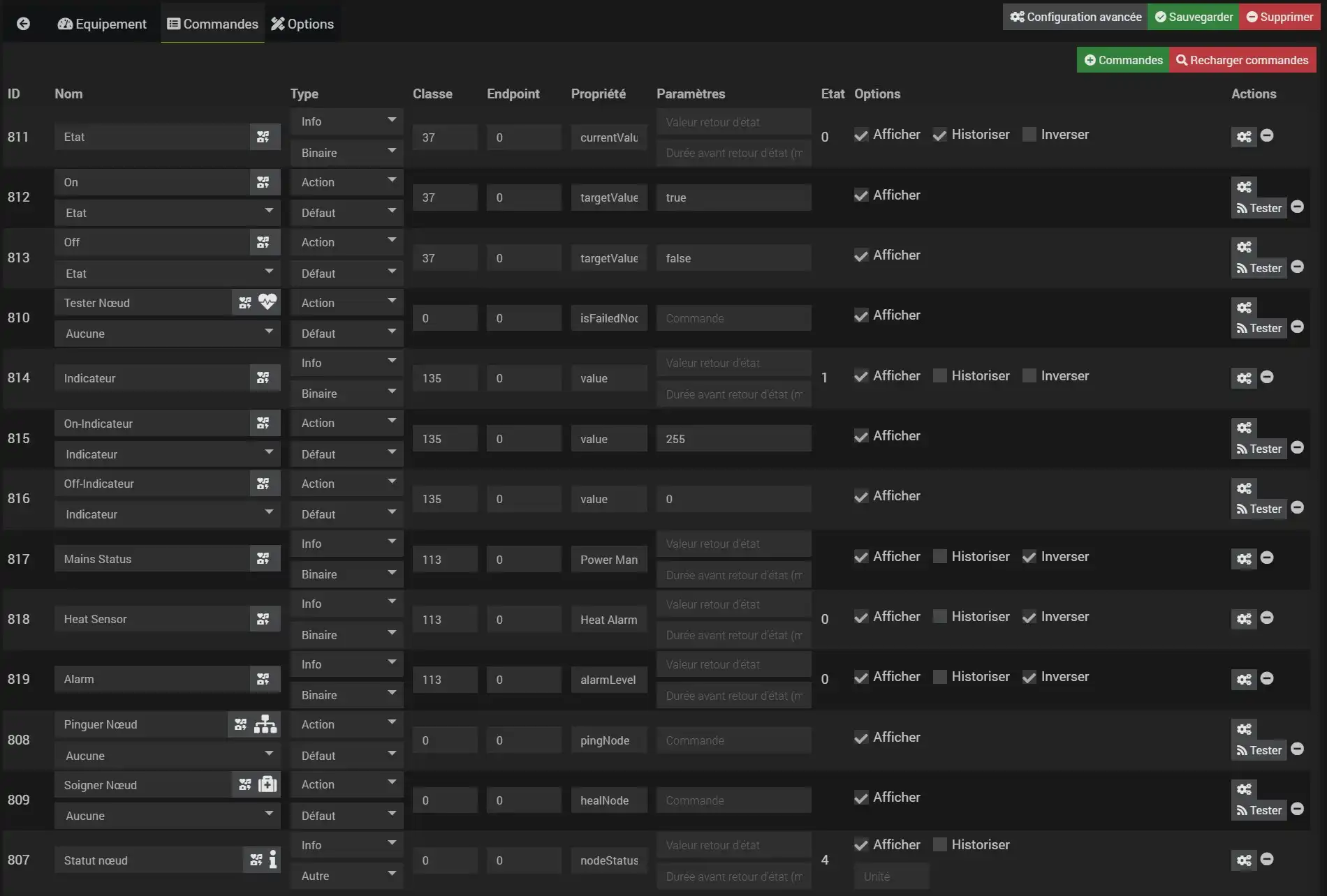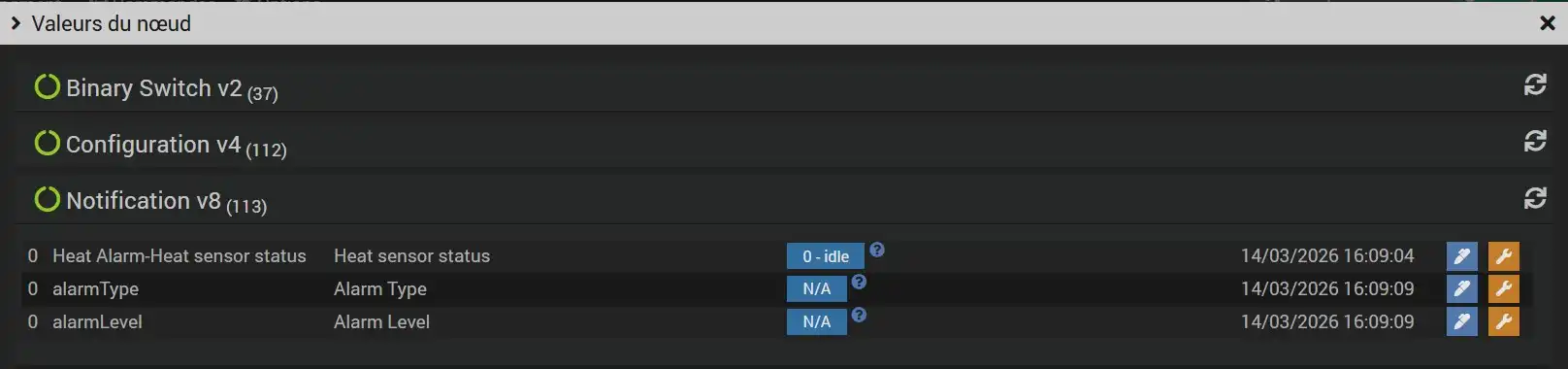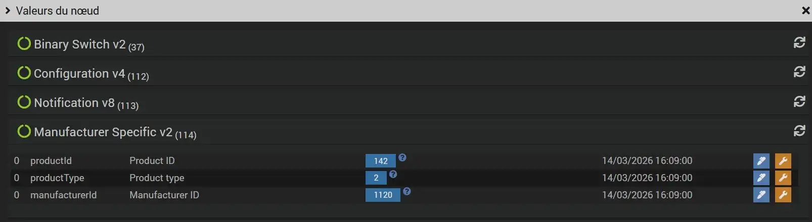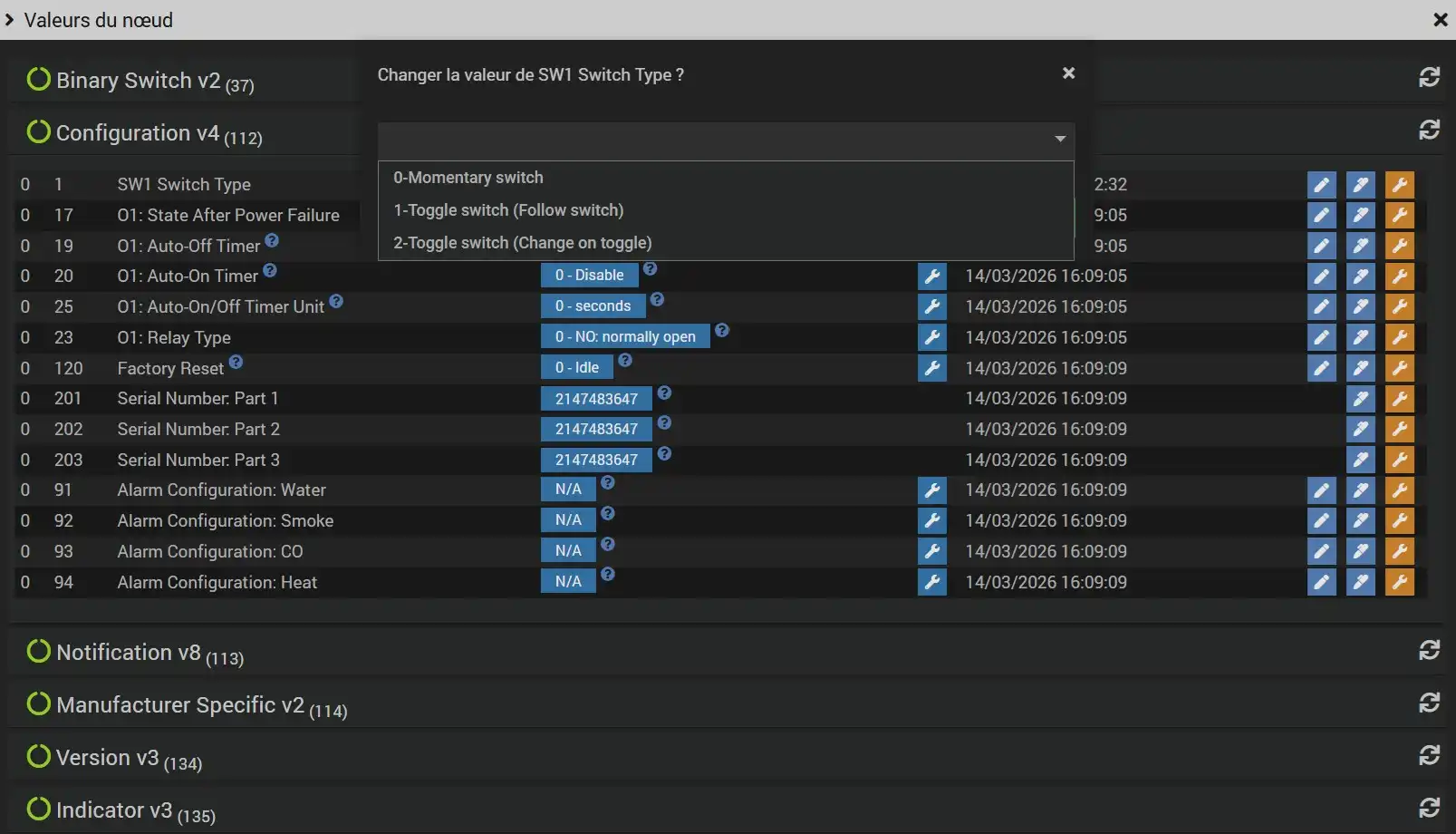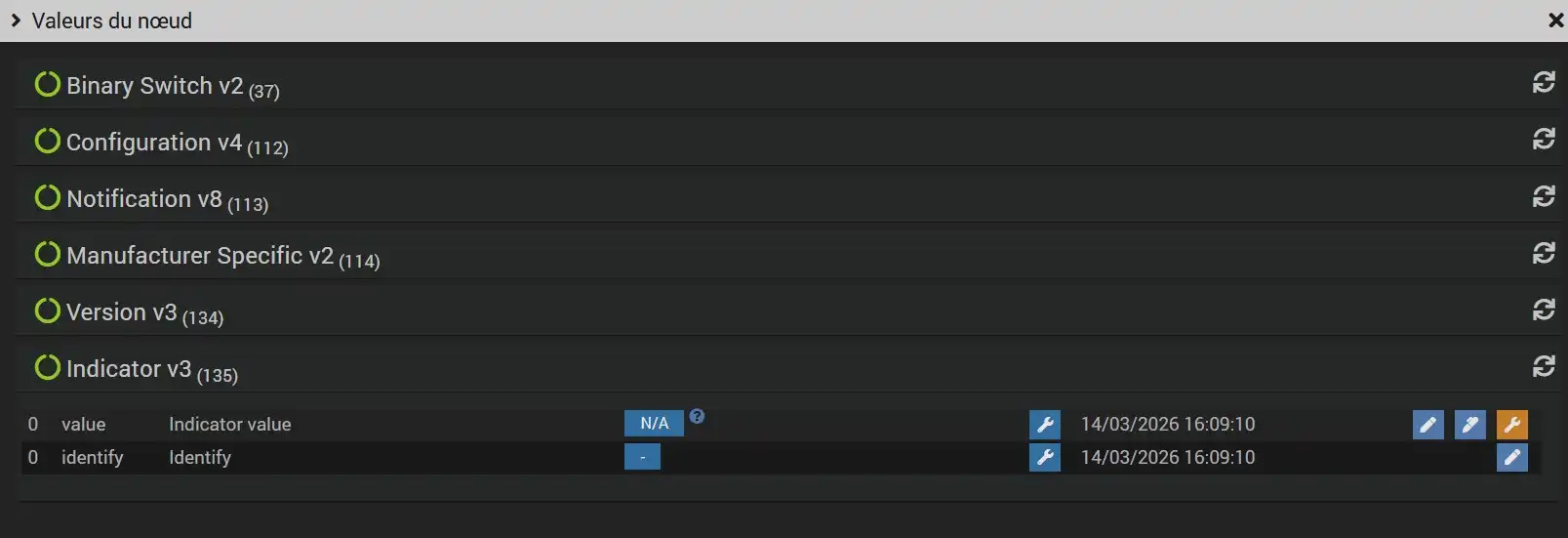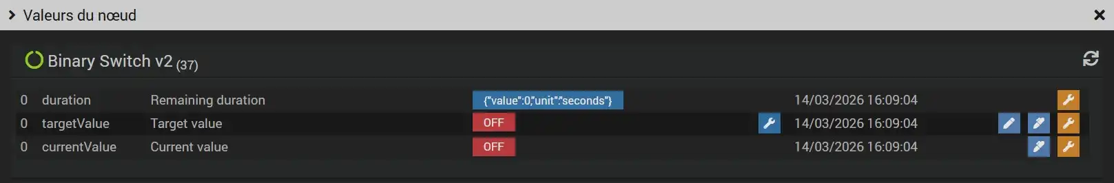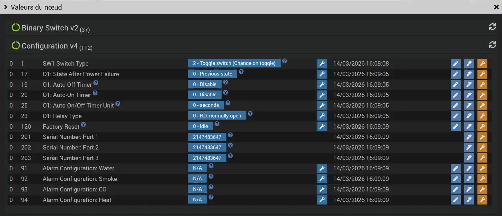 Tous les paramètres Z-wave sont visibles depuis le bouton Valeurs, ici les paramètres du nœud de la commande On/Off, les valeurs sont éditables via le bouton stylo orange, vous avez la possibilité de recréer les commandes avec le bouton stylo bleu