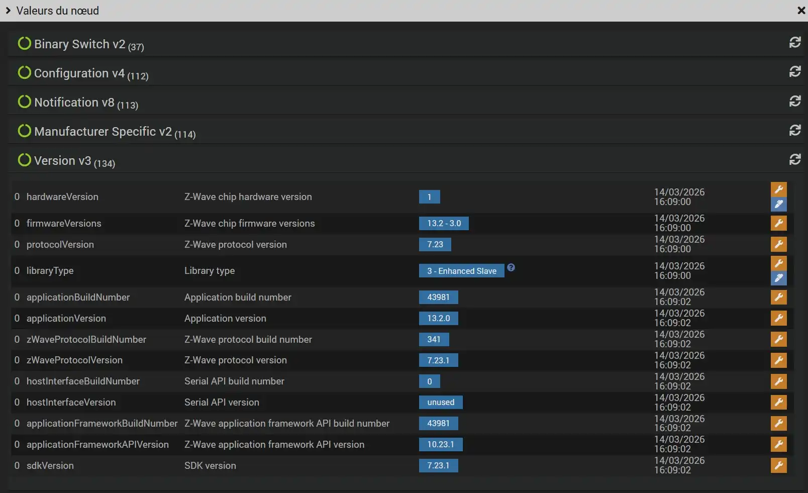 Sur cette vue nous voyons les paramètres concernant la version et informations Z-wave du produit